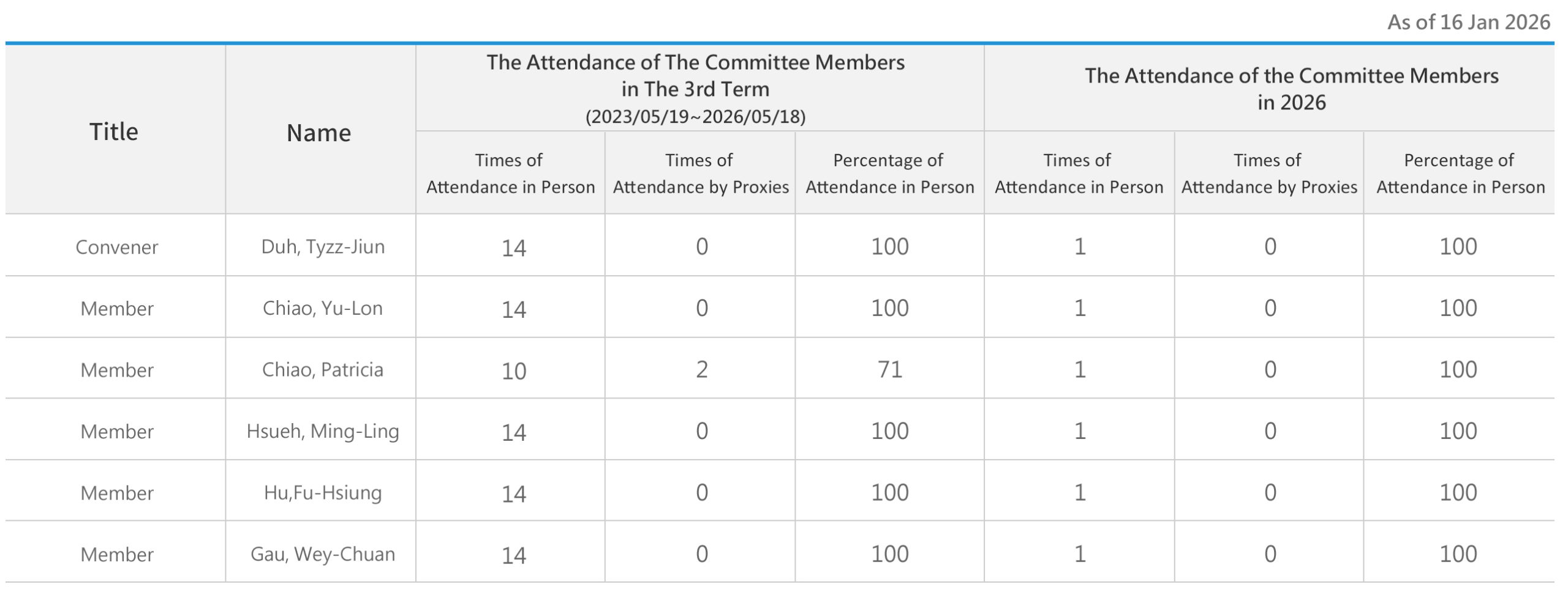 Work Experience: PwC Taiwan Director; Executive Director, Taiwan Corporate Governance Association; Adjunct Professor, School of Science and Technology Management, National Tsing Hua University; Adjunct Professor, School of Management, National Taiwan University of Science and Technology.